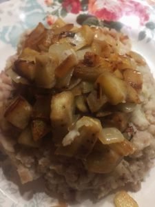 Je n’ai pas fait exactement comme toi : j’ai mélangé les oignons rôtis, l’orge et la purée, et je me suis passé des aubergines car je n’en avais pas. Eh bien c’était très bon, toute la famille a apprécié.
